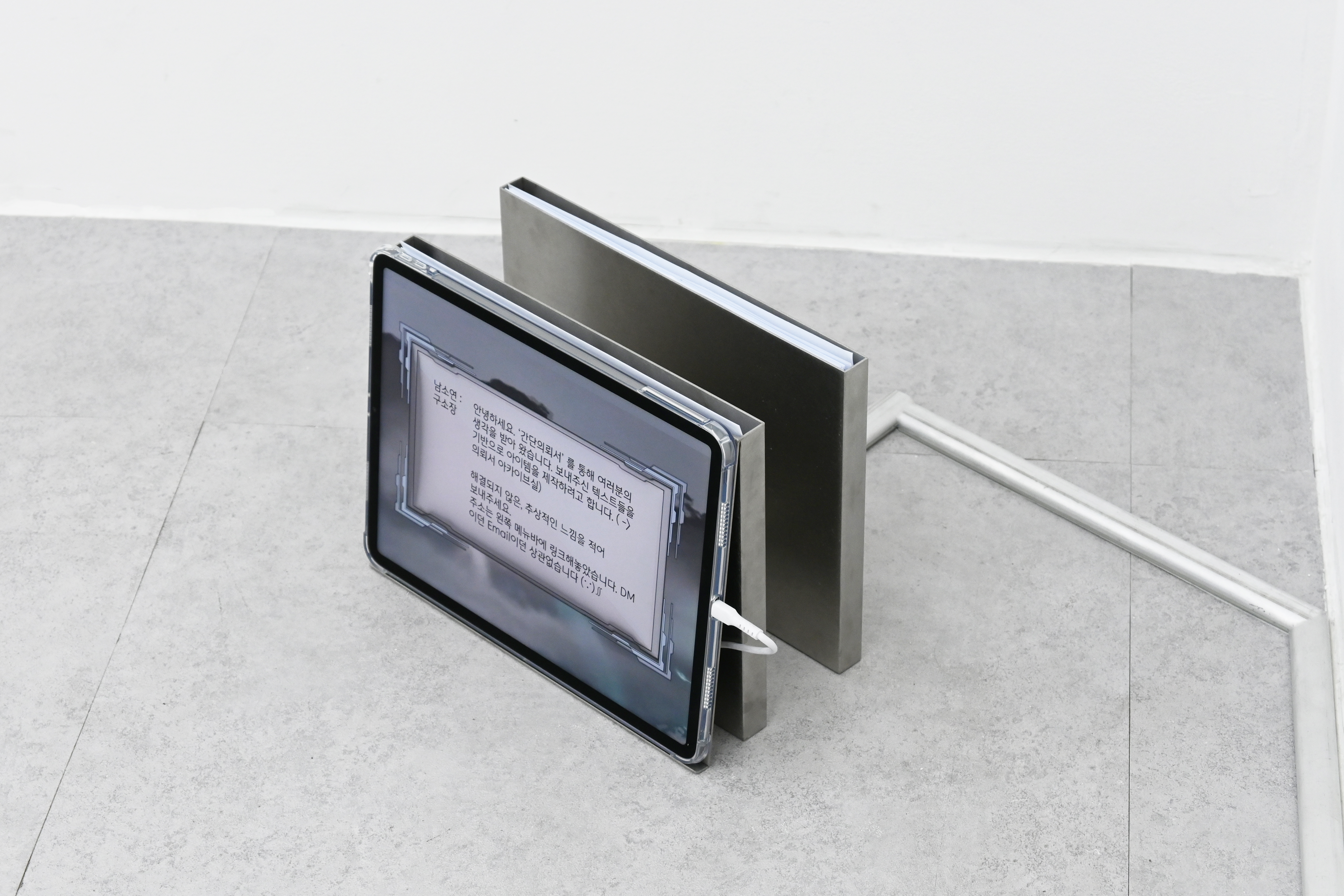 “namsoyeonguso Site에서 데려온 공지판” 2023. Single channel video, Aluminum, Printed paper, Variable installation